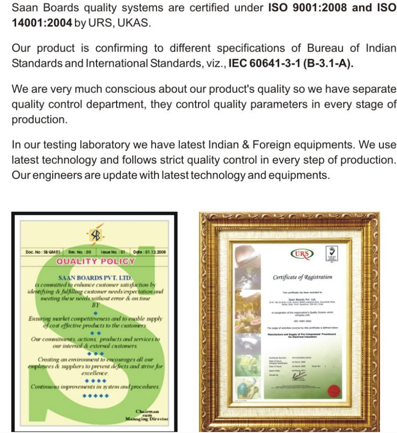 We have a big testing laboratory in our factory with latest equipments and experienced engineers. We are very much conscious about our product’s quality so we have separate Q.C. department, they controls quality parameters both in the production and in the finished products. Our Products conformed different specifications of Bureau of Indian Standards and International Standards, viz., IEC 60641-3-1 (B-3.1), JIS C 2305, DIN 7733, BS 231-1975 & IS – 1576 _ 1992.